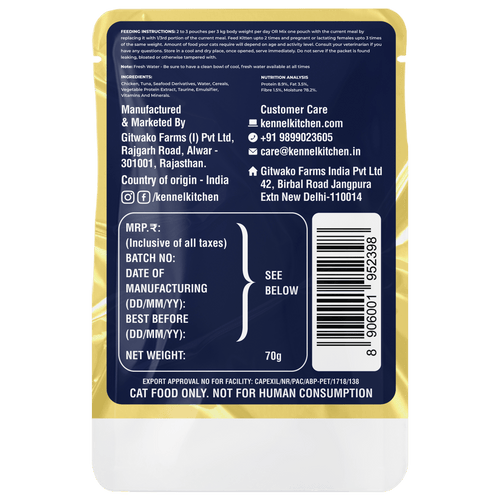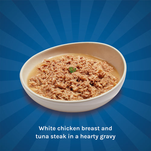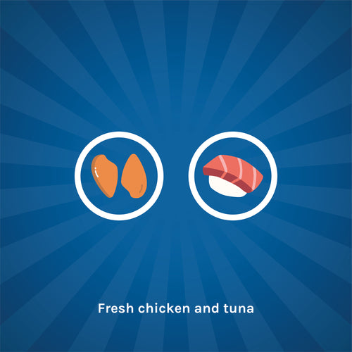 Kennel Kitchen Chicken and Tuna is ideal for adult cats and kittens. Made with white breast chicken that is mixed with tuna fillets. Free from corn, soy, preservatives and any Artifical flavours. This is one scrumptious meal for your cats and kittens.