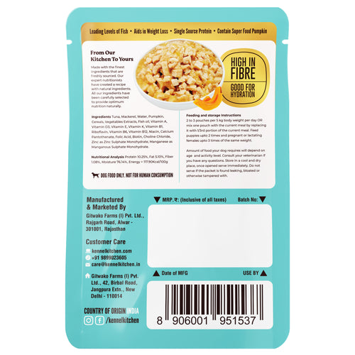 Supreme cuts in gravy fish recipe is packed with lean protein from fresh fish. It's rich in omega 3 and 6 fatty acids. Formulated with superfood pumpkin that is rich in fibre, good for hydration, rich in essential vitamins. Supreme cuts range is free from corn, soy, preservatives or any aritifical flavours. Suitable for both adult and puppies.